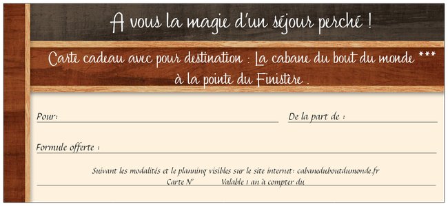 -Formule Cadeau " Week end dans une Cabane" à 190€ ou 250€ suivant la période souhaitée avec possibilité d'inclure un forfait électricité de 10€ .